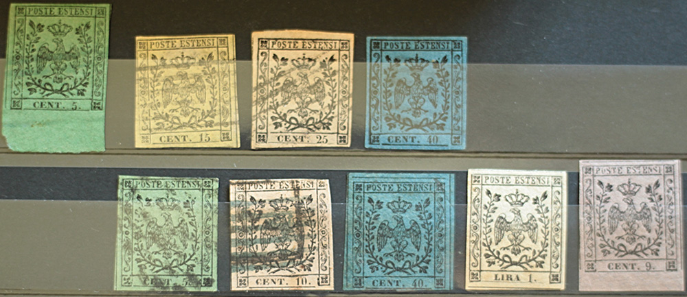 Modena 1852/57- lotto di num. 9 francobolli numeri 3,4,6,7,8,9,10,11, giornali 3 Prezzo di catalogo : 1.500 €