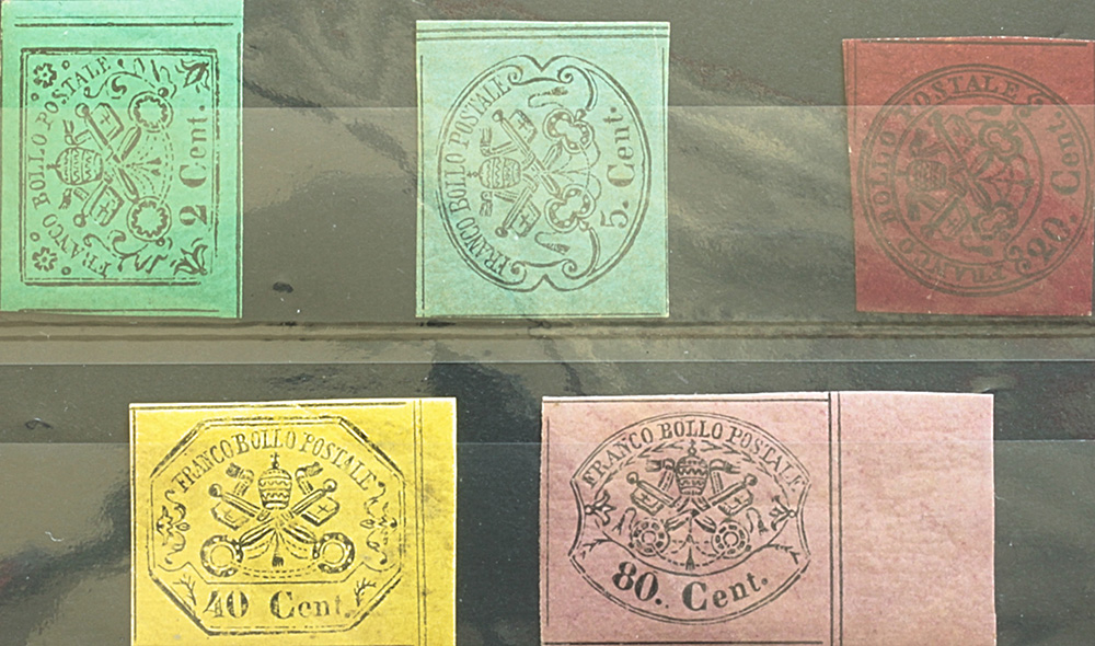 Stato Pontificio 1867-francobolli numeri 13,16,18,19,20, linguellati, numeri 16,18,19 firma Biondi Prezzo di catalogo : 1.650 €