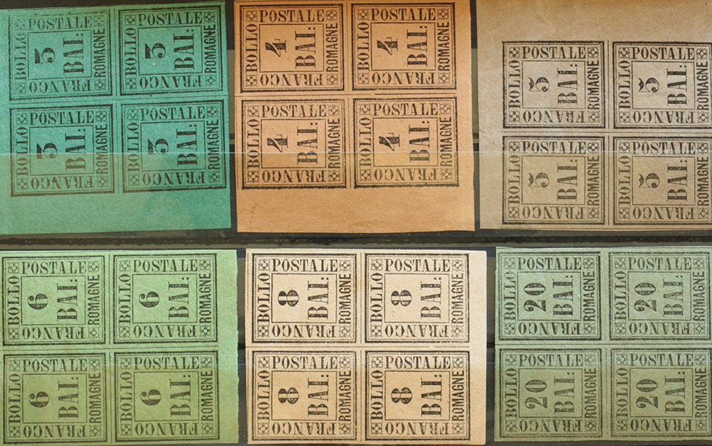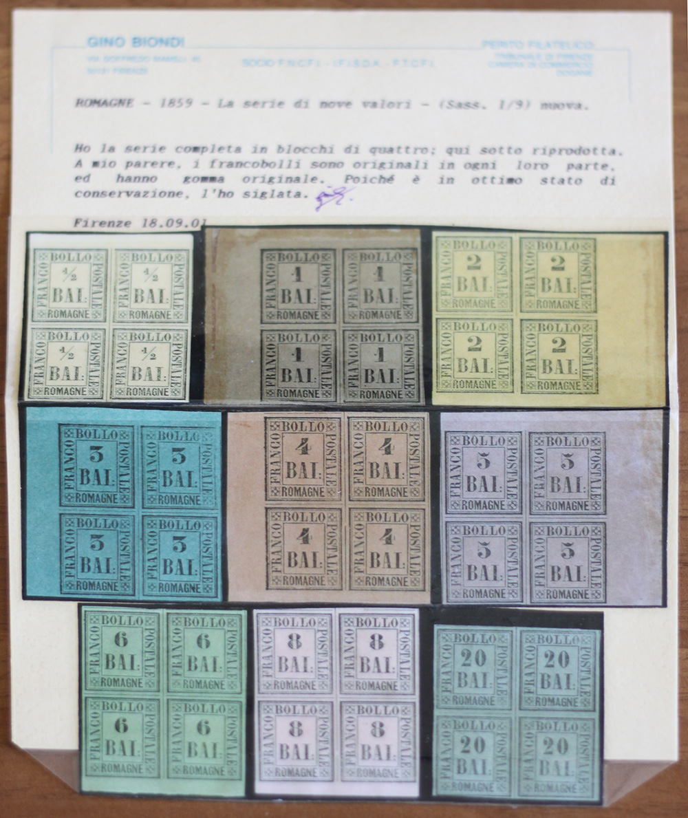 Romagne 1859- num.1-9 in quartine, con francobolli in parte linguellati, in parte senza linguella, certificato Biondi Prezzo di catalogo : 15.500 € ++