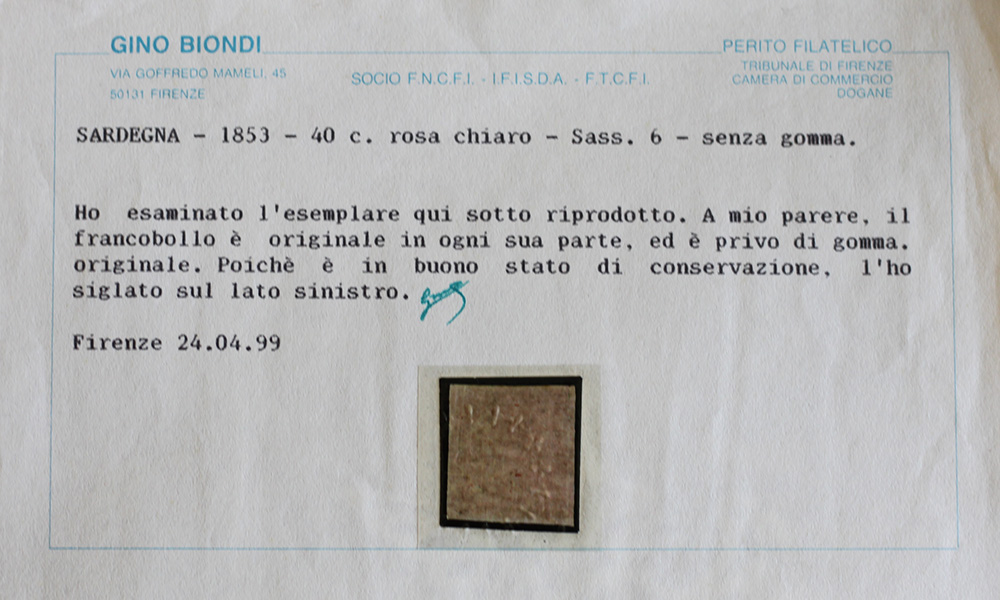 Sardegna 1853-num.6 senza gomma, certificato Biondi Prezzo di catalogo : 6.500 €