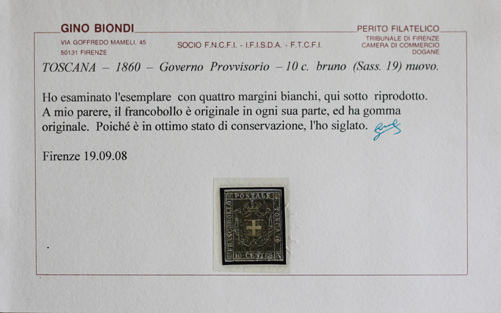 Toscana Governo Provvisorio 1860-num.19 linguellato, certificato Biondi...
