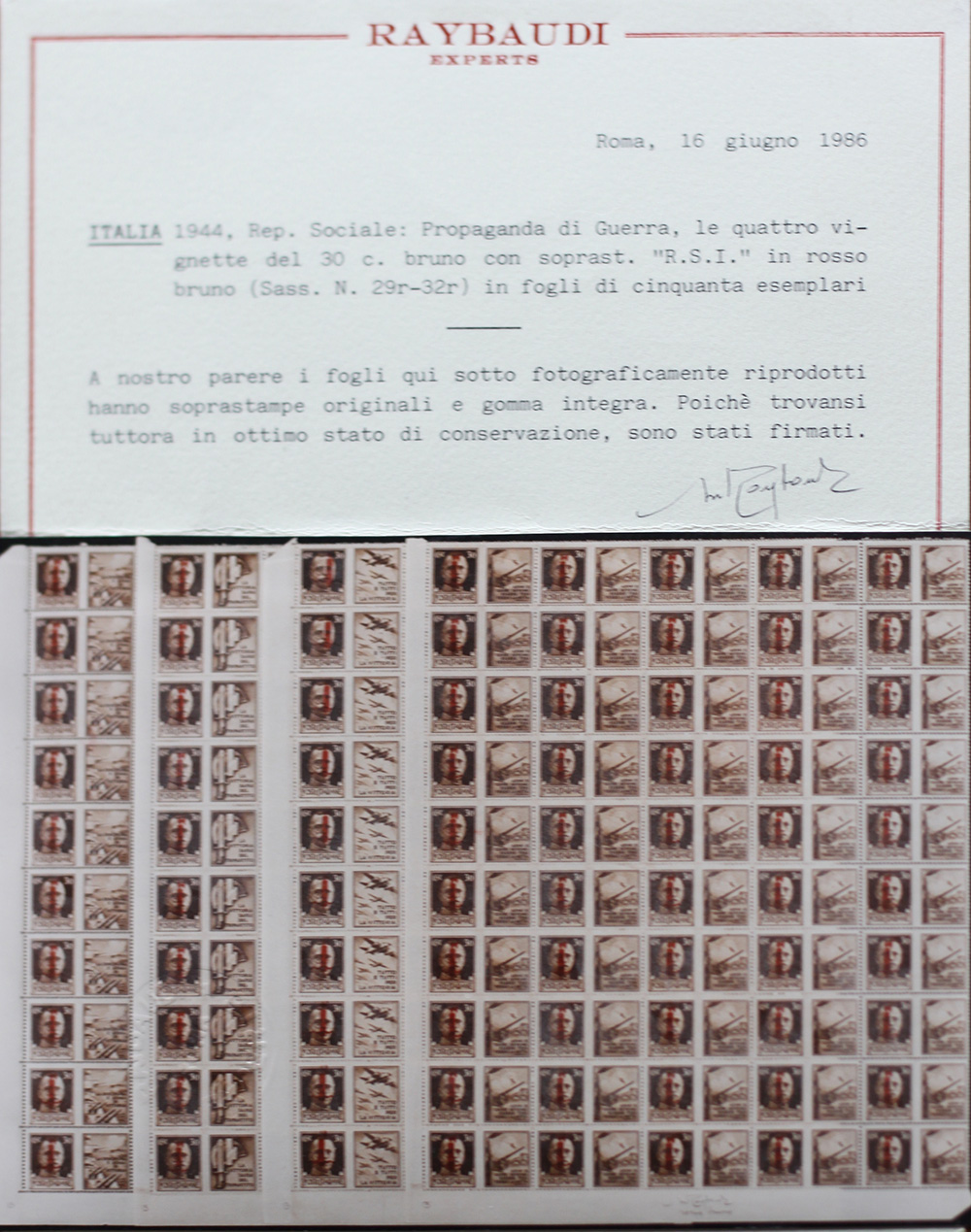 1944 propaganda di guerra num.29D-32D senza linguella, soprastampati in rosso bruno, in fogli da 50, certificato Ray Baudi Prezzo di catalogo : 5.000 € +