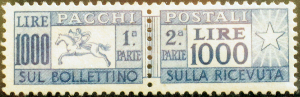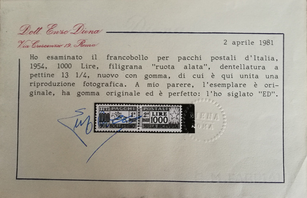 1954 pacchi postali num.81 linguellato, con certificato E.Diena+Biondi Prezzo di catalogo : 3.500 €