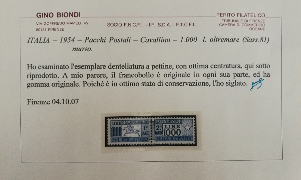 1954 pacchi postali num.81 linguellato, con certificato E.Diena+Biondi Prezzo...