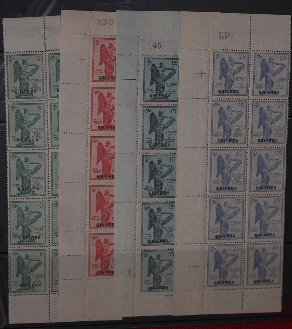 1922 Eritrea num-50-53 in blocchi di 10 d'angolo senza linguella con esemplare con filigrana piccola croce, + 4 esemplari senza filigrana, presenti num.3 numeri di tavola Prezzo di catalogo : 1.100 € +
