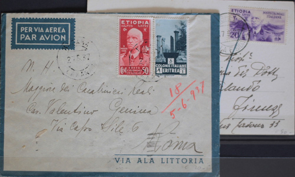 1936 Etiopia num.2 su cartolina, num.5, + Eritrea 209 su busta, num.6, +...