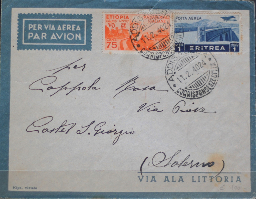 1936 Etiopia num.2 su cartolina, num.5, + Eritrea 209 su busta, num.6, + Eritrea aerea 21 su busta Prezzo di catalogo : 520 €