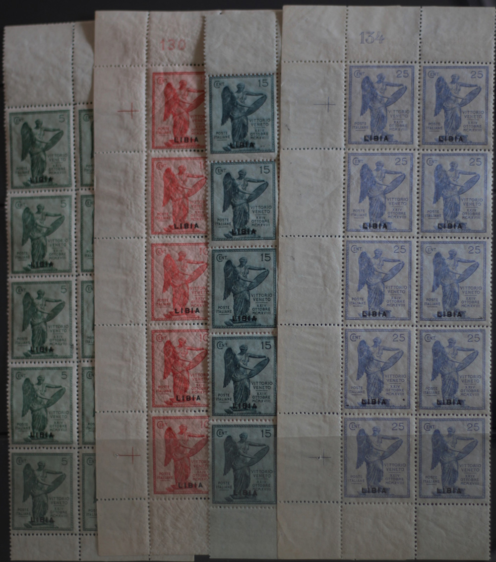 1922 Libia num.34-37 in blocchi di 10 d'angolo senza linguella con esemplare con filigrana piccola croce, + 4 esemplari senza filigrana, presenti num.2 numeri di tavola Prezzo di catalogo : 1.100 € +