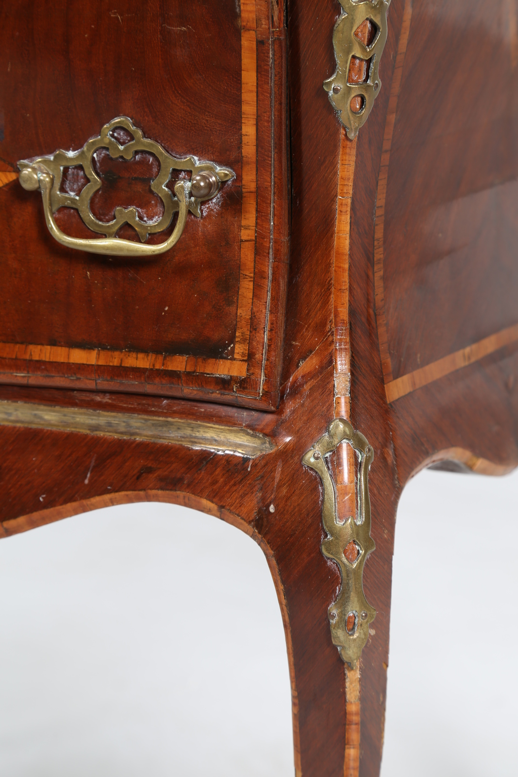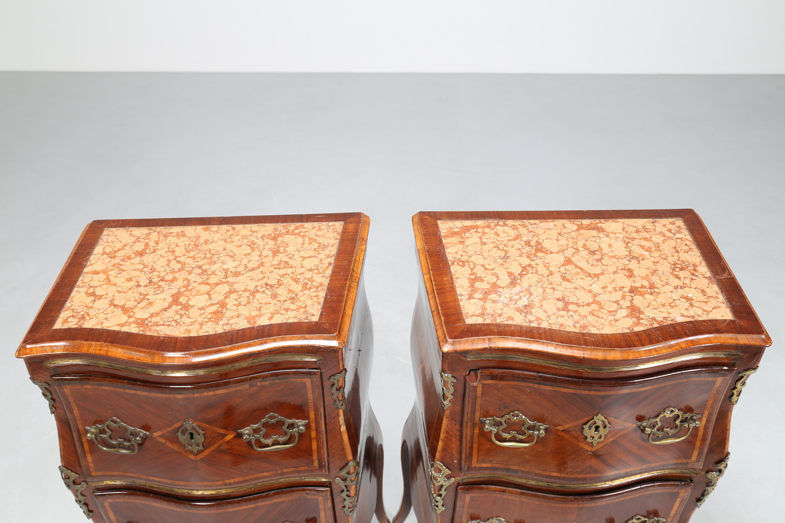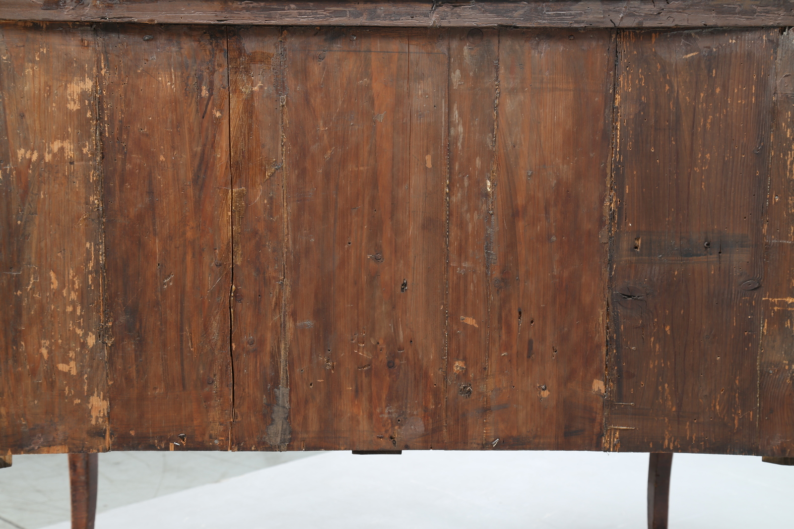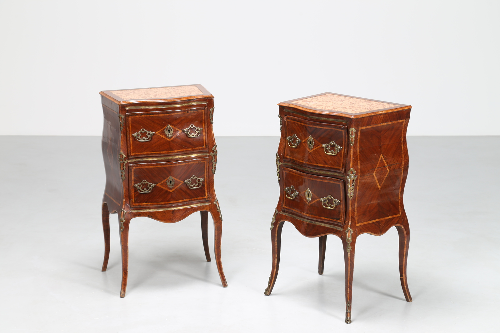 MANIFATTURA SICILIANA DEL XVIII SECOLO Cassettone e due comodini lastronati e filettati, mossi sul fronte e i fianchi, piano in marmo, gambe arcuate. . Cm 121,00 x 100,00 x 55,00. Difetti e restauri. Comodini: 85,00 x 48,00 x 36,00 cm.