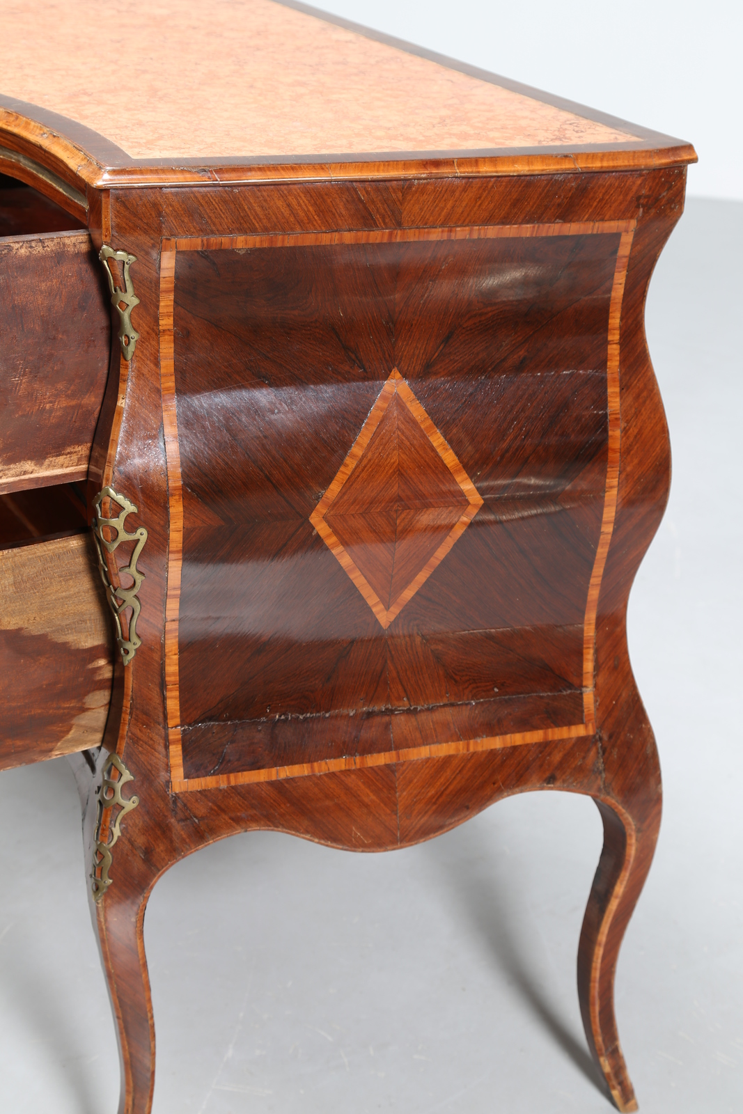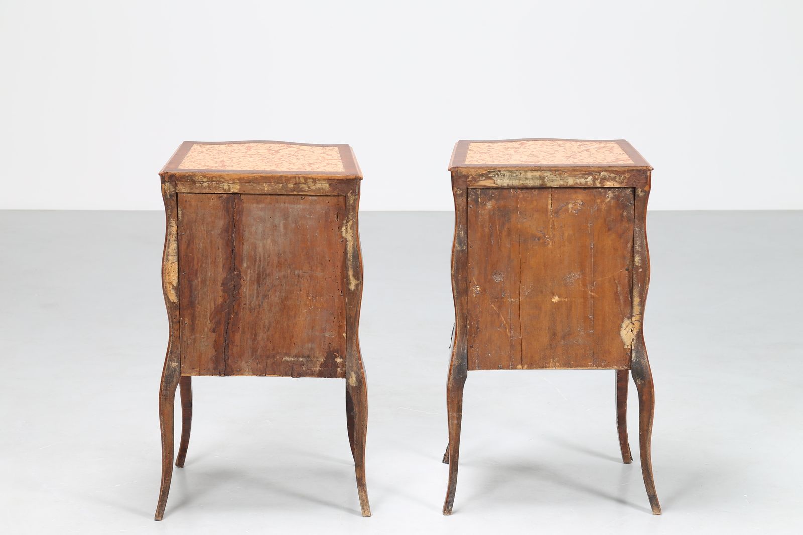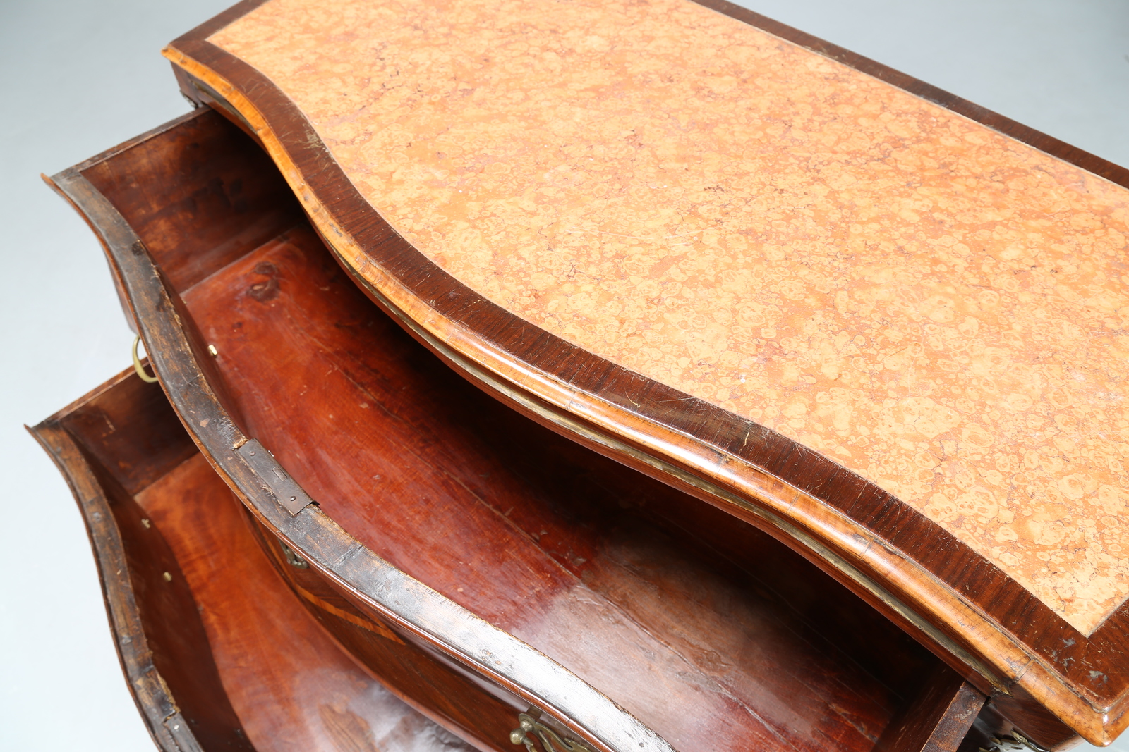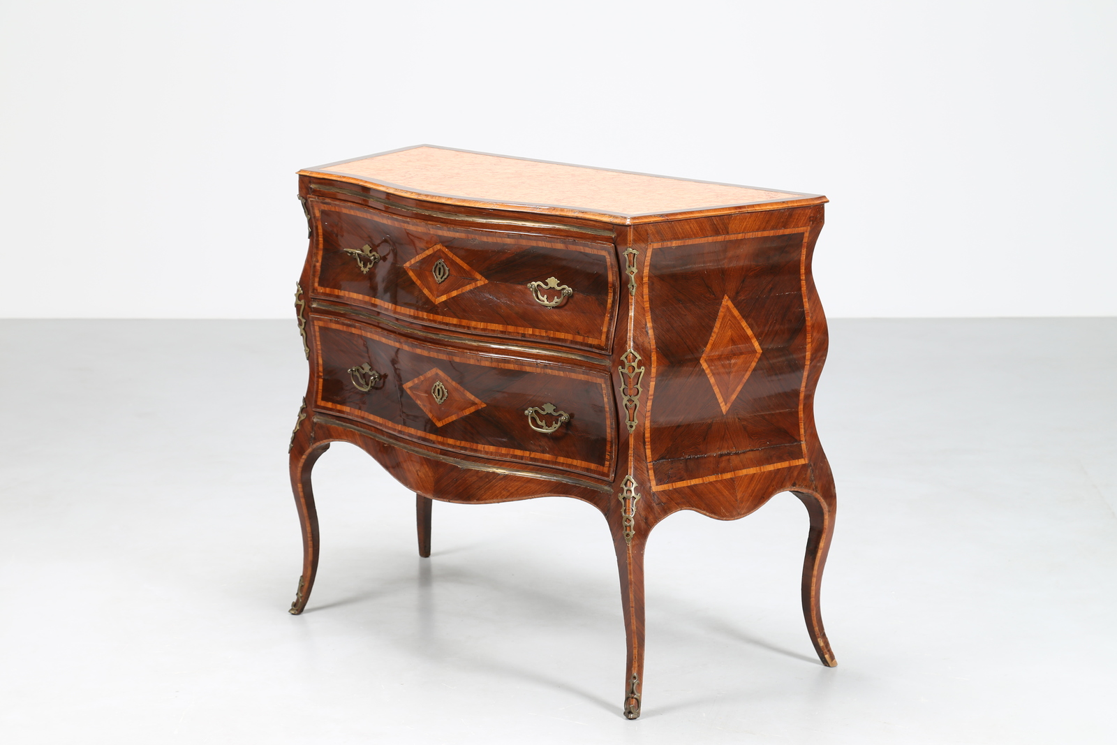 MANIFATTURA SICILIANA DEL XVIII SECOLO Cassettone e due comodini lastronati e filettati, mossi sul fronte e i fianchi, piano in marmo, gambe arcuate. . Cm 121,00 x 100,00 x 55,00. Difetti e restauri. Comodini: 85,00 x 48,00 x 36,00 cm.