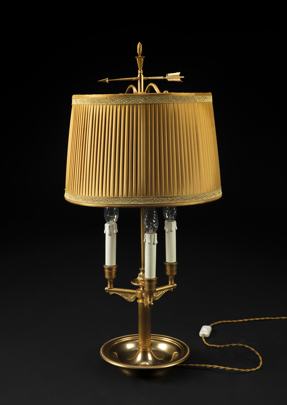 MANIFATTURA DEL XIX SECOLO Lampada a tre fiamme in ottone. . Cm 25,00 x 21,50 x 22,00.