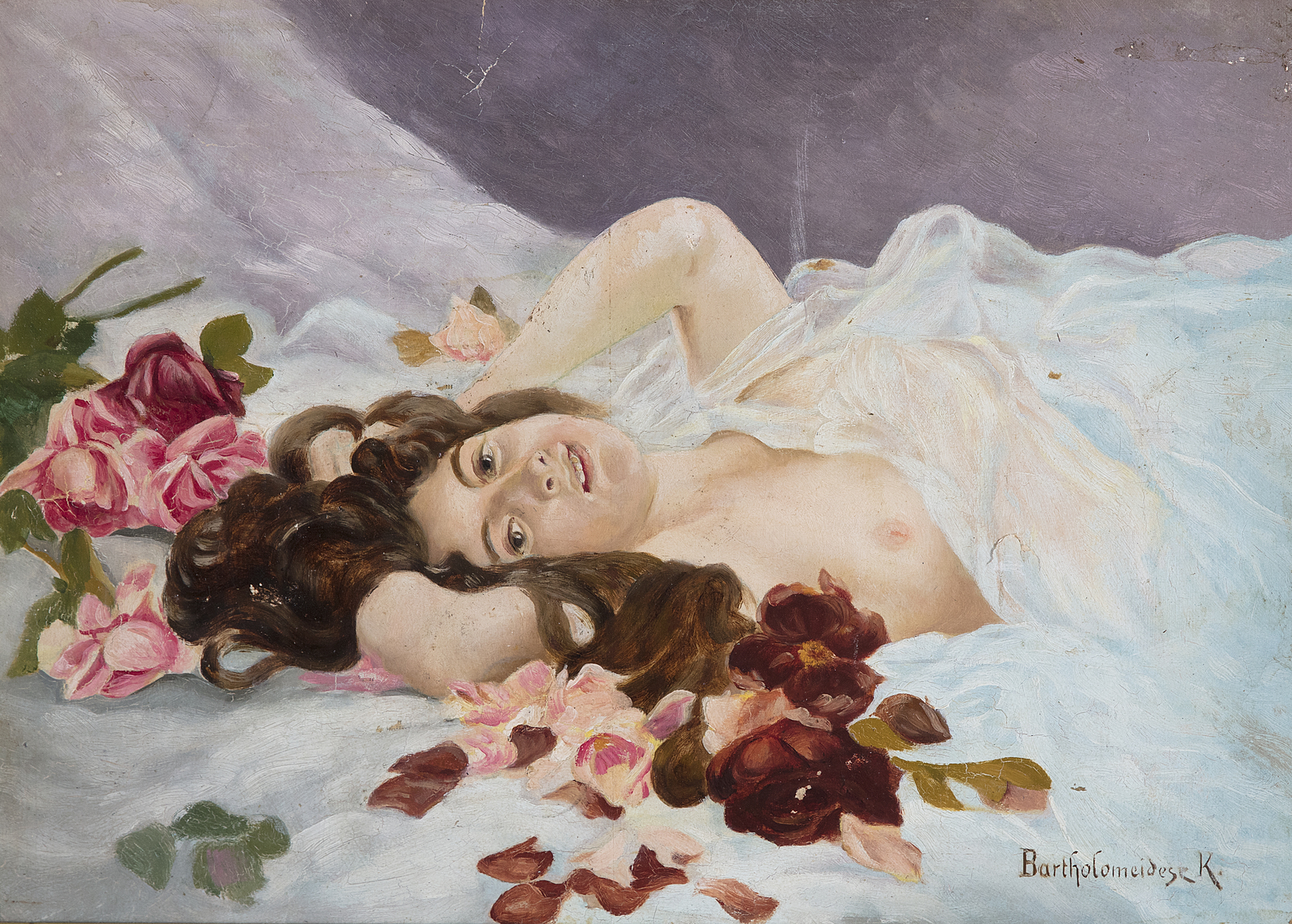 ARTISTA DEL XIX SECOLO Donna distesa con fiori. . Olio su cartone pressato. Cm 30,00 x 43,00. Firmata Bartholomeidese K. in basso a destra. Cornice presente