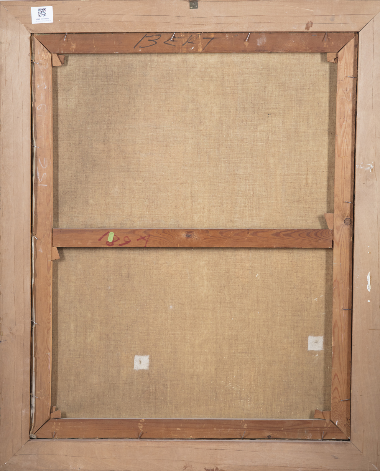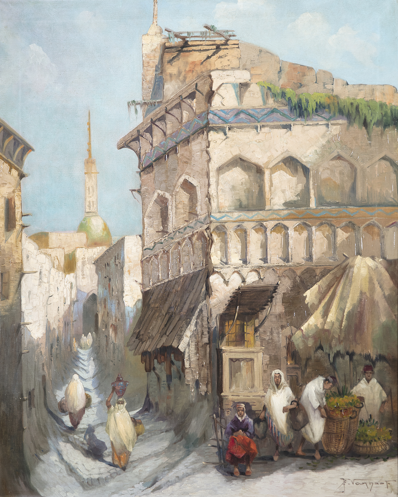 ARTISTA DEL XIX SECOLO Via di città mediorientale con minareto. Olio su tela . Cm 80,00 x 101,00. Firmato in basso a destra F Van Hoof (?). . Cornice presente