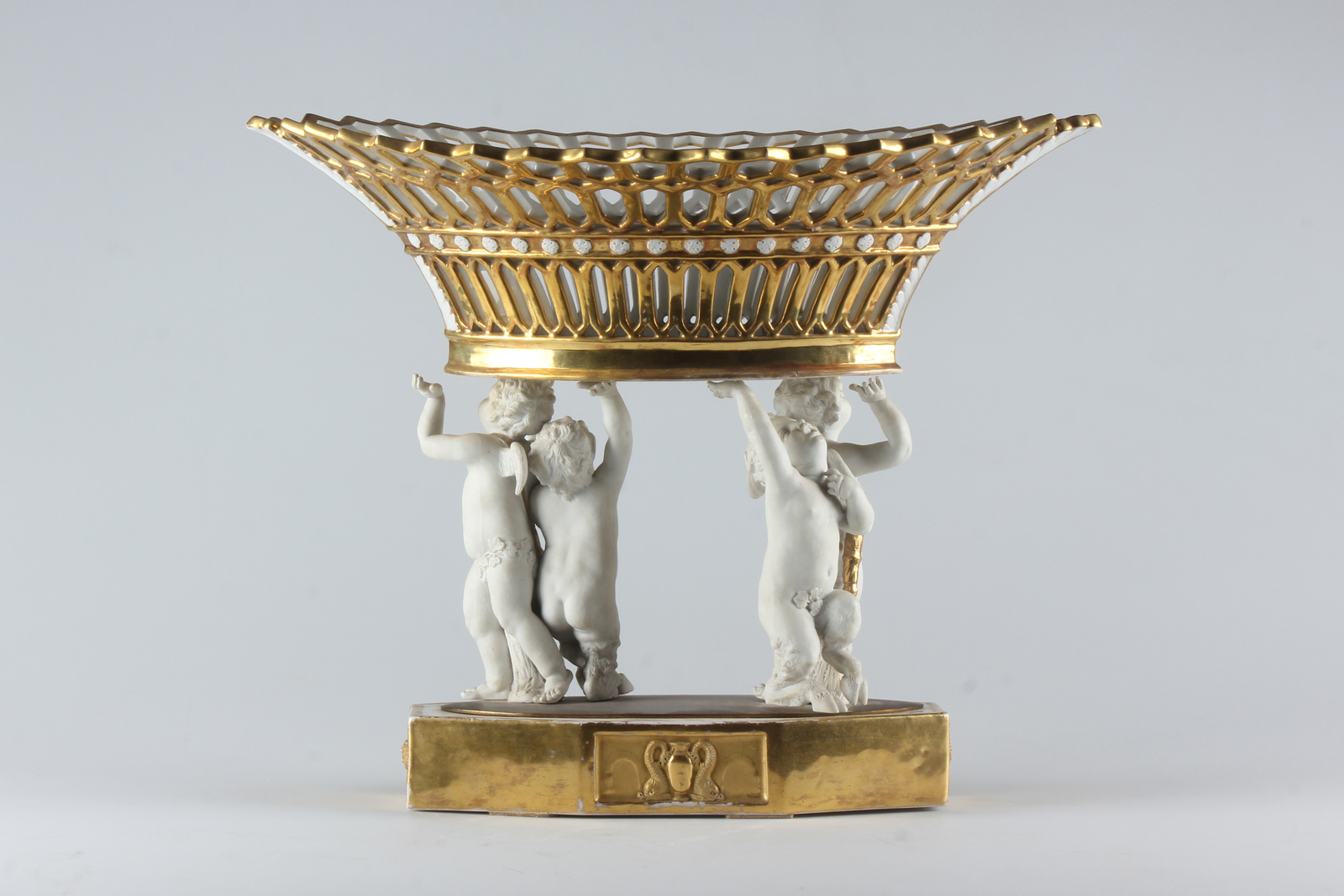 FRANCIA, XIX SECOLO Grande alzata centrotavola, in porcellana bianco-oro e biscuit, base circolare su cui poggiano tre amorini e faunetti che sostengono la coppa con tesa traforata. . Cm 46,00 x 37,00 x 29,00. Lievi mancanze alla doratura.