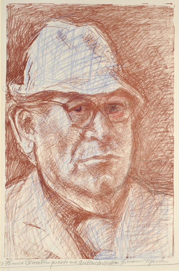 Giovanni March (Tunisi, 1894 - Livorno, 1974) Autoritratto Matite su base litografica, cm. 53,5x37,5 Firma e deica in basso al centro. € 150/250