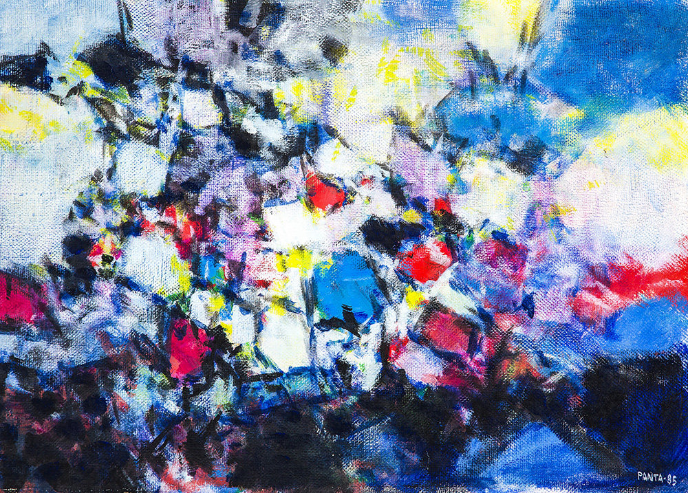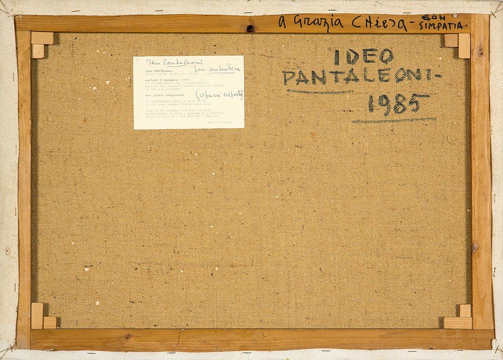 IDEO PANTALEONI 1904 - 1993 Senza titolo, 1985 Acrilico su tela, cm. 50 x 70 Firmato e datato in basso a destra Autentica dell’artista sul retro Dedica dell’artista a Grazia Chiesa sul retro Etichetta D’Ars, Milano sul retro ESPOSIZIONI: “Mon jardin imaginaire”, Studio p.r. d’arte, Milano, novembre 1985 Prov. Collezione Privata