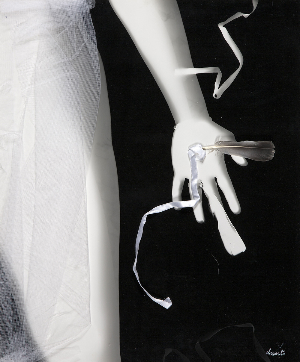 GIUSEPPE DESIATO 1935 Senza titolo Assemblaggio, tulle, piuma, nastro su fotografia, cm. 59 x 49 Firmato in basso a destra Timbro Galleria d’Arte Moderna 31, Napoli sul retro Prov. Collezione Privata