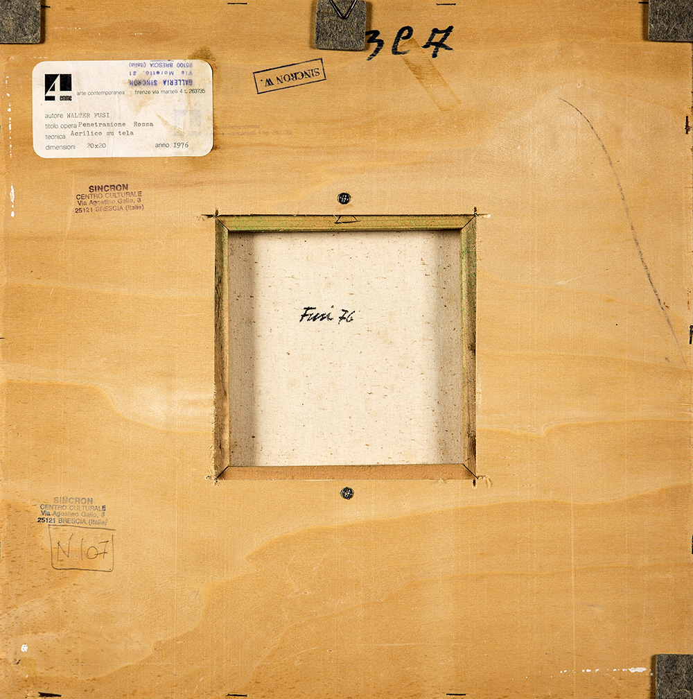 WALTER FUSI 1924 - 2013 Penetrazione rossa, 1976 Acrilico su tela, cm. 20 x 20 Firmato e datato sul retro Etichetta 4 emme arte contemporanea, Firenze sul retro Timbro Sincron W. Brescia, sul retro Timbro Centro Culturale Sincron, Brescia sul retro Prov. Collezione Privata