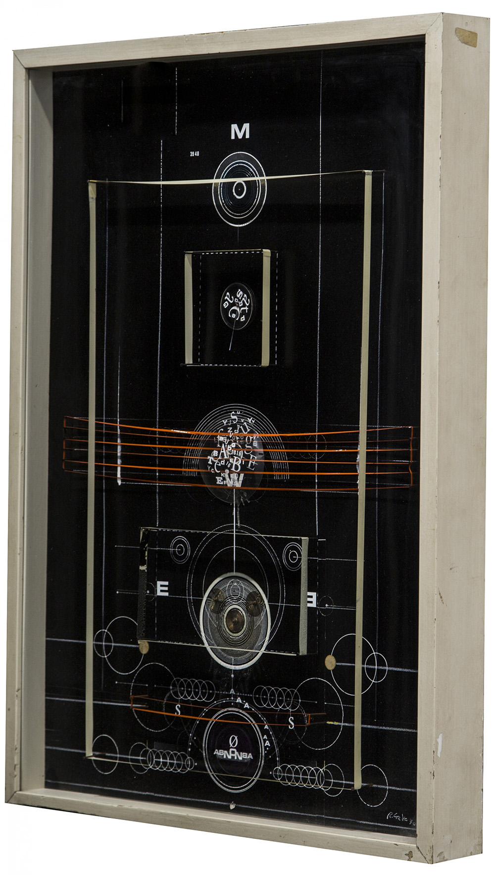 RICCARDO CORTE 1941 Composizione, 1970 Assemblaggio, alluminio, materiale plastico e tecnica mista su tavola in box di legno e vetro, cm. 71,5 x 52,5 x 7 Firmato e datato in basso a destra Etichetta e timbro Galleria Cortina, Milano sul retro Prov. Collezione Privata