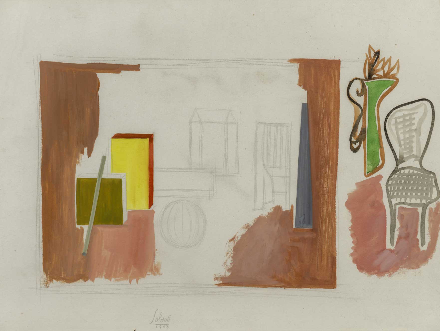 ATANASIO SOLDATI (1896 - 1953) Interno con poltrona 1943 Tecnica mista su...