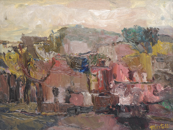 Alfredo Martelli Vecchio paese Olio su cartone, cm. 30x40 Firmato in basso a destra: "Martelli". Sul verso: firma, titolo e dedica; timbro Steen Arte Figurativa, Firenze. € 400/600