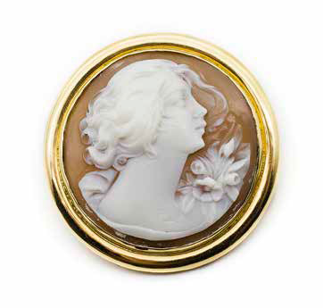 Spilla - cammeo con montatura in oro giallo, gr. 20,2, raffigurante testa muliebre.
