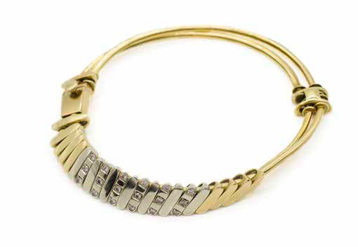 Bracciale in oro bianco e giallo e diamanti, gr. 32,5, ad elementi mobili eseguito da Gem Montebello su disegno di Piero Dorazio.