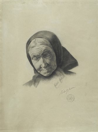 Adele Micheli Testa di vecchia, 1898 Carboncino su carta, cm. 58x43 Firma e data in basso a destra e timbro Istituto Belle Arti, Firenze, con firma per visto di Giovanni Fattori. € 500/700