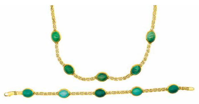 Parure composta da collana e bracciale in oro giallo e turchesi, peso complessivo gr. 31.