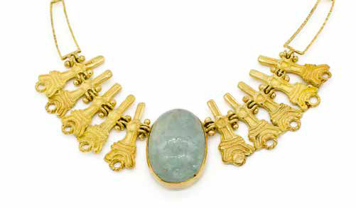 Collier in oro giallo, gr. 45,3, con acquamarina milk, design di Flaminia Valignani.