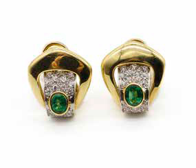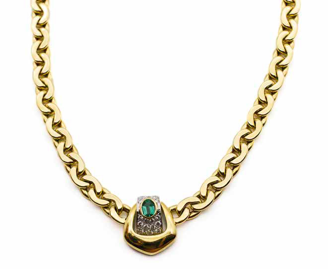 Parure composta da collier in oro giallo, gr. 35,6, con diamanti del peso complessivo di ct. 0,60 ca, e smeraldo ct. 1 ca., e orecchini, gr. 14,5, con diamanti del peso complessivo di ct. 1,20 ca, e smeraldi del peso complessivo di ct. 1,8ca.