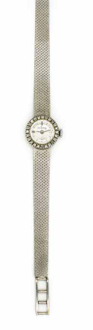 Orologio da donna Nileg in oro bianco con diamanti, gr. 22,50, bracciale a stuoia e movimento a carica manuale