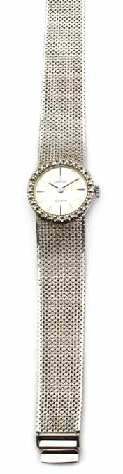 Orologio da donna Omega in oro bianco, gr. 43,6, quadrante bianco contornato da diamanti con indici a bastone applicati, lancette a bastone, bracciale a stuoia e movimento a carica manuale.
