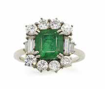 Anello in oro bianco, gr. 4,5, con diamanti taglio brillante e baguette del peso complessivo di ct. 1 ca, e smeraldo di ct. 3 ca.