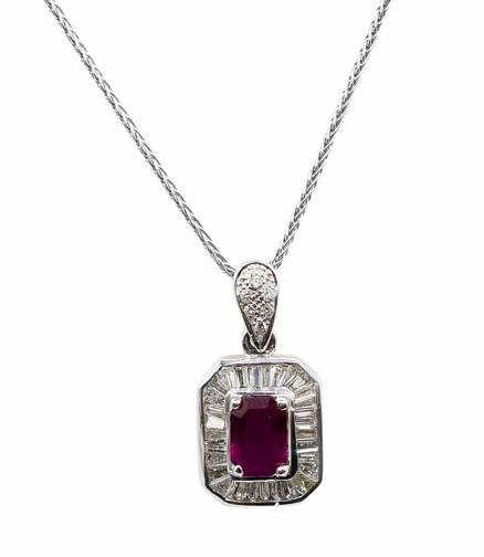 Pendente in oro bianco con collanina, gr, 6,5, con diamanti taglio taper e brillante del peso complessivo di ct. 0,77 ca. e rubino ct. 1,05 ca.