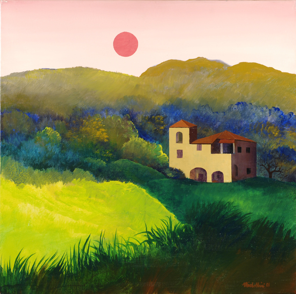Sirio Midollini (Firenze, 1925 - 2008) Paesaggio con casolare, 2001 Acrilico su tela, cm. 60x60 Firma e data in basso a destra. € 1.000/1.500