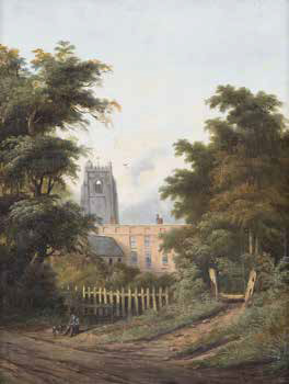 Scuola Inglese del XIX secolo SCORCIO URBANO olio su tela applicata su compensato, cm 40x33.