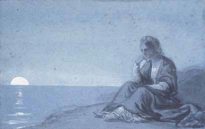 Scuola Francese del XIX secolo DONNA CHE GUARDA LA LUNA gouache su carta, cm 11,5x18