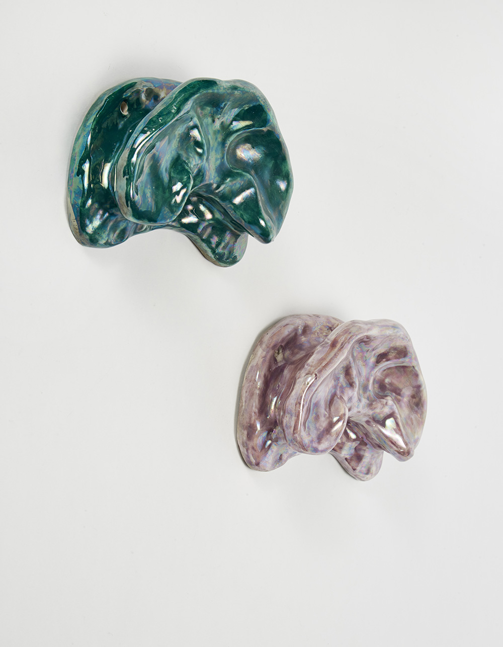 Two green and light amethyst underglaze cast ceramic coat hangars. Italy, 1950s. (16.5x6.5x10 cm.)