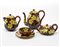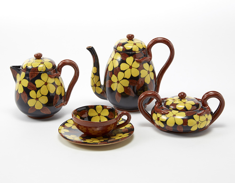 Servizio da caffè in ceramica con decoro a fiori gialli su fondo nero composto da sei tazzine con piattini, caffettiera, lattiera e zuccheriera. Albisola, anni '30. (difetti)