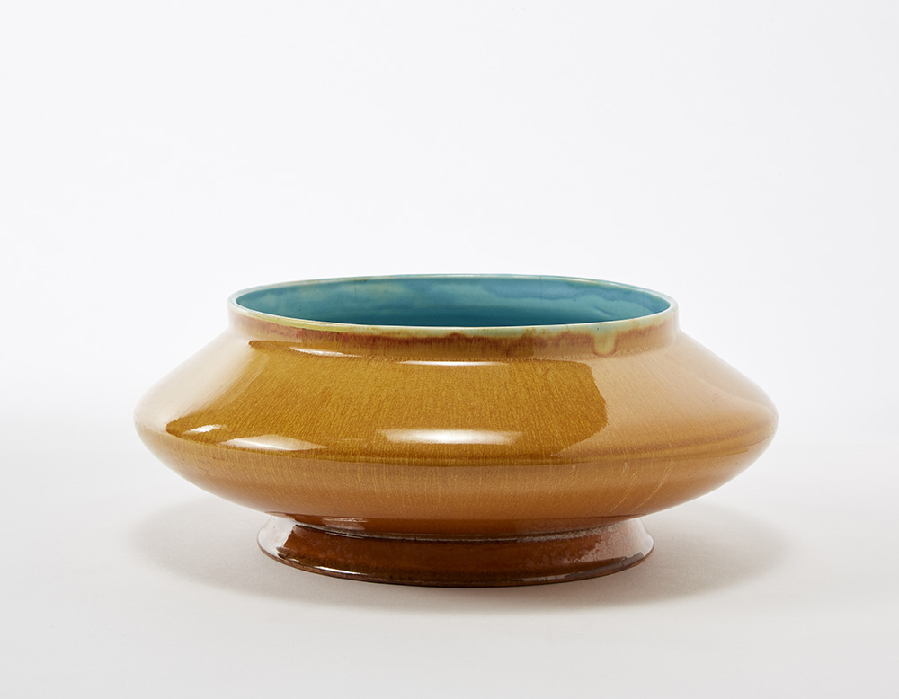 Cachepot in terraglia dipinta in policromia. Manifattura Linthorpe, Inghilterra, 1879-1883. Recante firma, marchio della manifattura e numero del modello incussi sotto la base. (h cm 10,5) (lievi difetti)