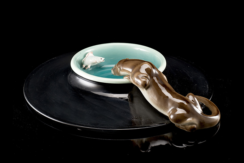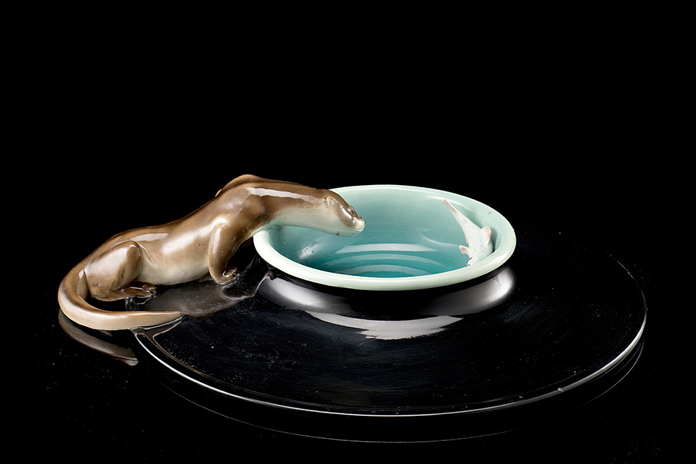 "Lontra su piatto" Polychorme undeglaze cast ceramic. Manufacture of Lenci, Turin, 1933. Signed under the base "Lenci MADE IN ITALY TORINO 7.1.33" and with the monogram of the decorator and the "BOTTEGA D'ARTE L. BELTRAMI ALESSANDRIA" paper label. (d 56 cm.) (slight defects and minor restoration) Literature A. Panzetta, Le ceramiche Lenci. Catalogo dell'Archivio storico 1928-1964, Allemandi, Torino 1992, cat. n. 308/P, p. 164