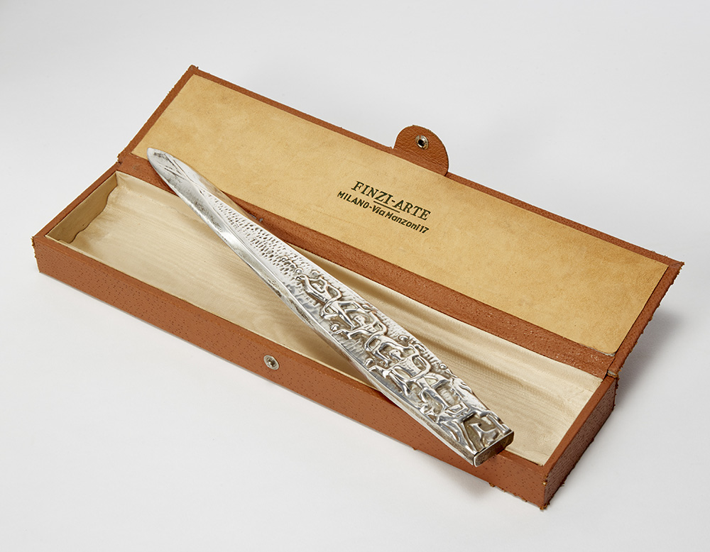 Tagliacarte in argento sbalzato a rilievo con figure di acrobati. Milano, anni '50. Argento titolato 800 e marcato a incussione. In custodia originale. (gr 100)