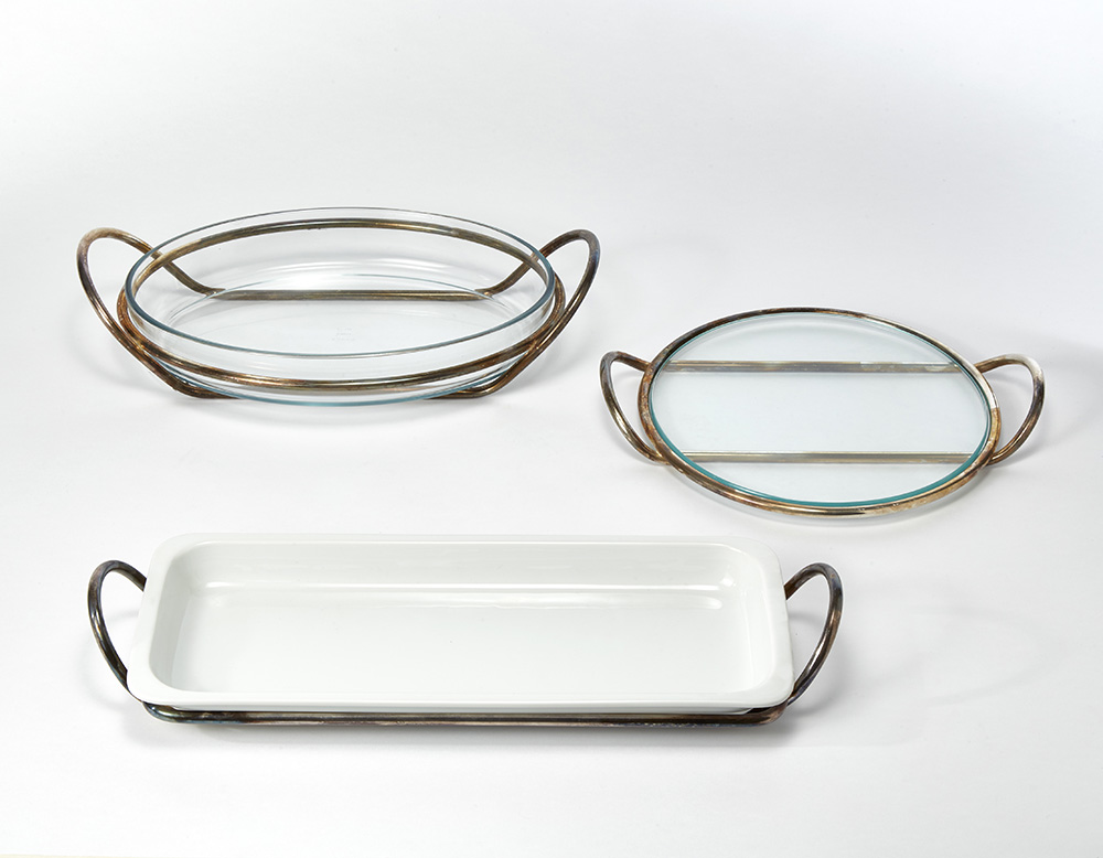 Tre vassoi da portata. Italia, anni '80/'90. Metallo argentato, vetro, ceramica. Marcati a incussione "Sabattini MADE IN ITALY" e con ologramma della manifattura. (misure varie)
