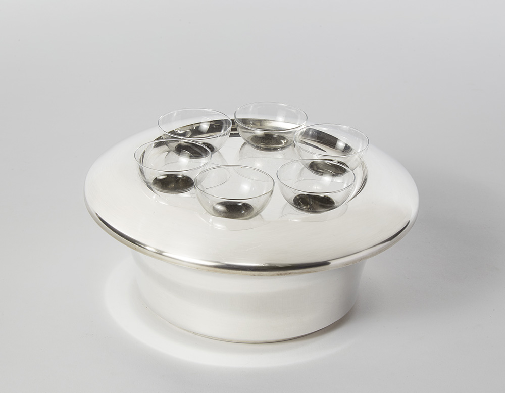 Servizio da vodka. Anni '70. Metallo argentato e vetro. Marcato "Sabattini made in italy" e con il monogramma della manifattura sotto la base. (h cm 13; d cm 25,5)