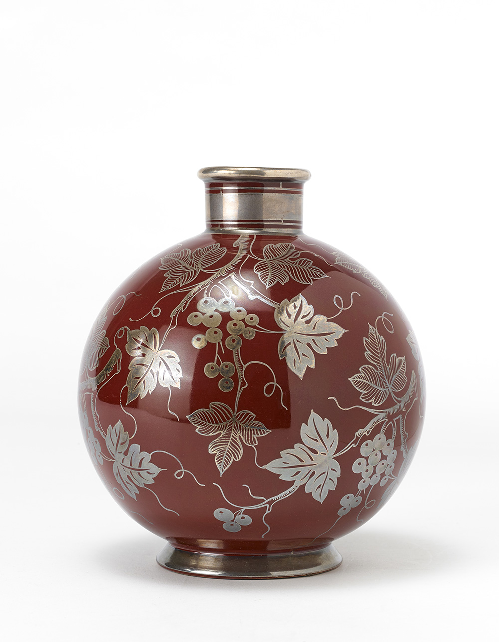 Vaso in maiolica modello "M 1186". Manifattura Richard Ginori, Doccia, 1930ca. colore di fondo "409 E Gran Rosso", decoro con soggetto raffigurante tralci di vite applicati in lamina d'argento. Recante marchio "Richard Ginori”, M 1186, 409 E. (h cm 23) (lievi difetti)