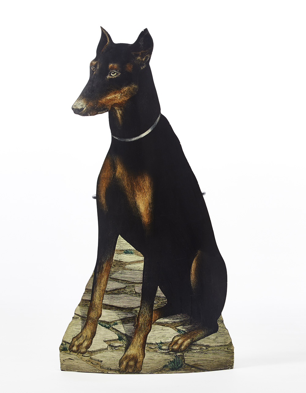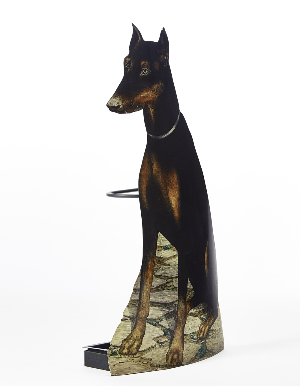 Trompe l 'oeil umbrella stand model "Doberman". Milan, 1960s/1970s. Metal paint decorated with silk-screen, showing a dobermann. (h 86 cm.) (slight defects and repainting)