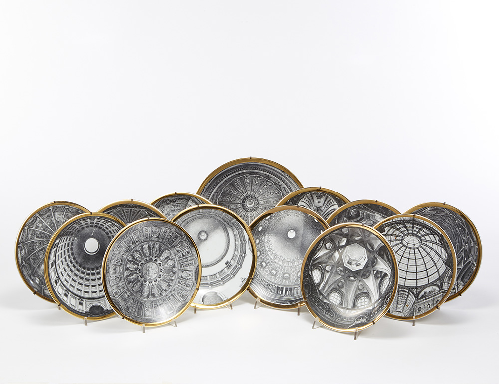 Complete set of thirteen ceramic plates decorated in balck and gold of the series "Cupole d'Italia". Milan, 1979. Numbered in gold on the verso. Collection reserved to friends of Ing. Andrea Brenta. (small plates: d cm 24.5; large plate: d cm 30.5 ) (slight defects)