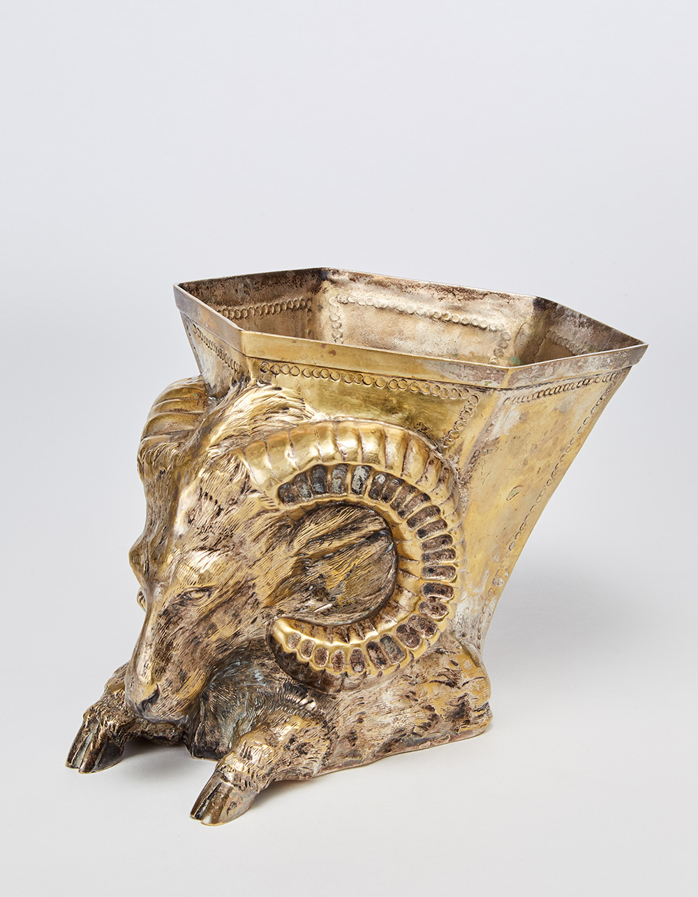 Cachepot modello "Muflone". Milano, 1970. Rame sbalzato, cesellato a mano e argentato. Firmata a incussione sotto la base "Gabriella Crespi". (cm 25x16x19) (lievi difetti)
