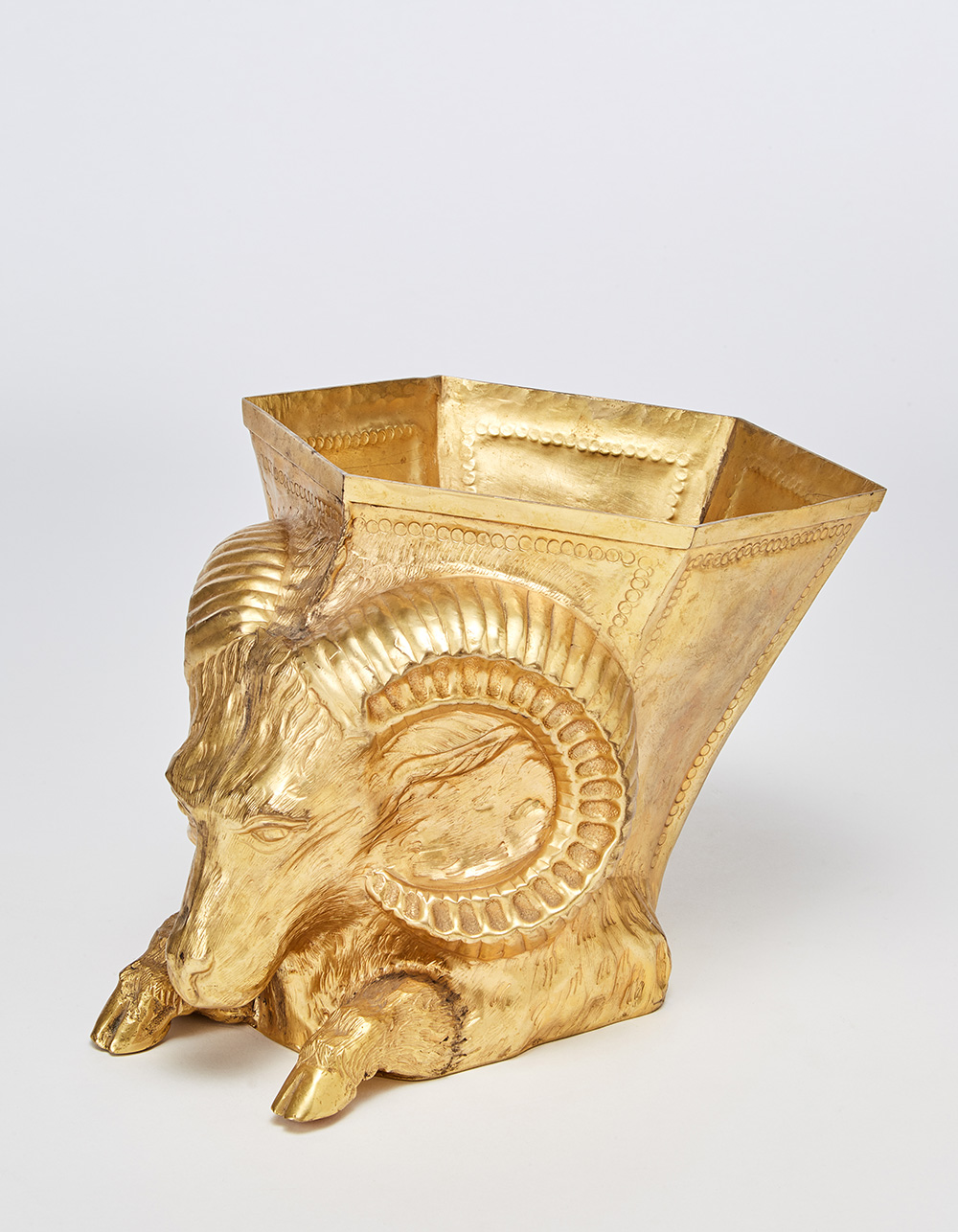 Chaiselled end embossed gilt-copper cachepot model "Muflone". Milan, 1970. Signed to base "Gabriella Crespi". (25x16x19 cm.)